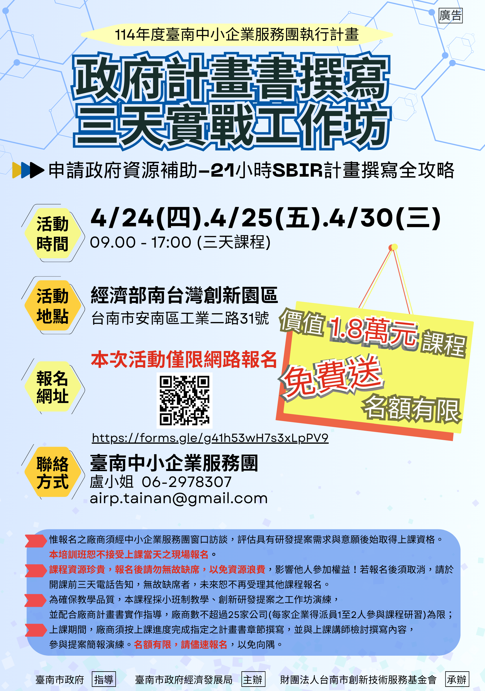 📍地點:經濟部南台灣創新園區 201教室 (臺南市安南區工業二路31號2樓)