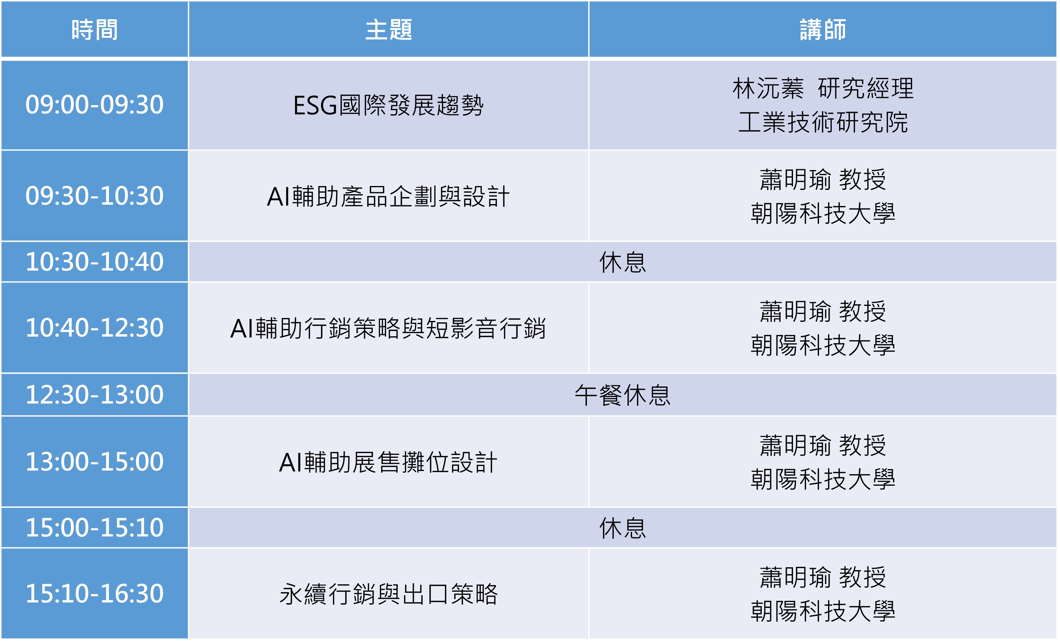課程內容將結合單向講授式與分組討論實作,透過案例帶領與會企業針對出口產品需求進行減碳因應與實作,協助我國企業制定ESG應對措施,精進風險管理與實踐能力,國際議題趨勢,以利爭取國際訂單。