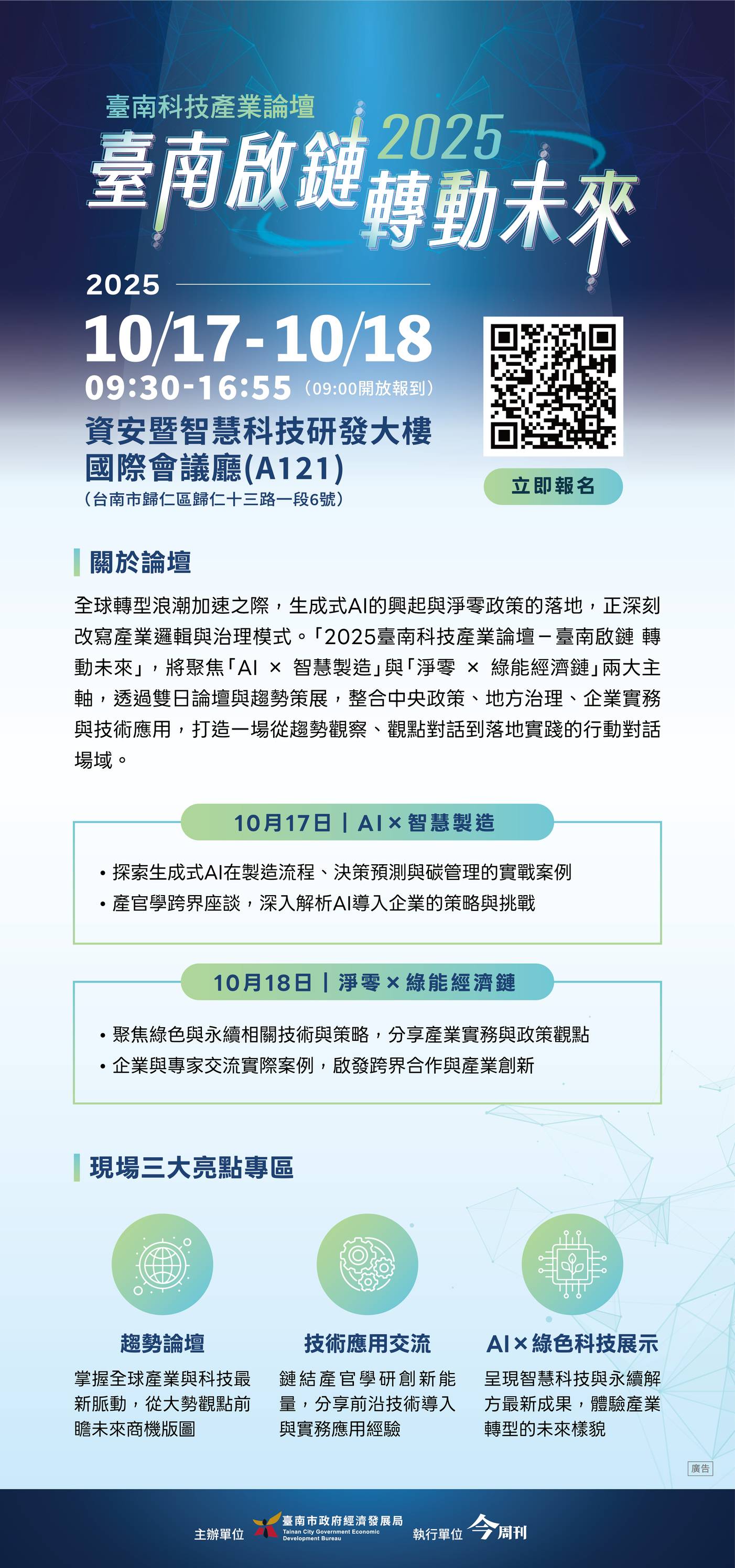 誠摯邀請您參加由臺南市政府主辦,《今周刊》承辦的「2025臺南科技產業論壇-臺南啟鏈轉動未來」,本年度論壇將聚焦「AI × 智慧製造」與「淨零 × 綠能經濟鏈」兩大主軸,透過雙日論壇與趨勢策展,整合中央政策、地方治理、企業實務與技術應用,打造一場從趨勢觀察、觀點對話到落地實踐的行動對話場域。